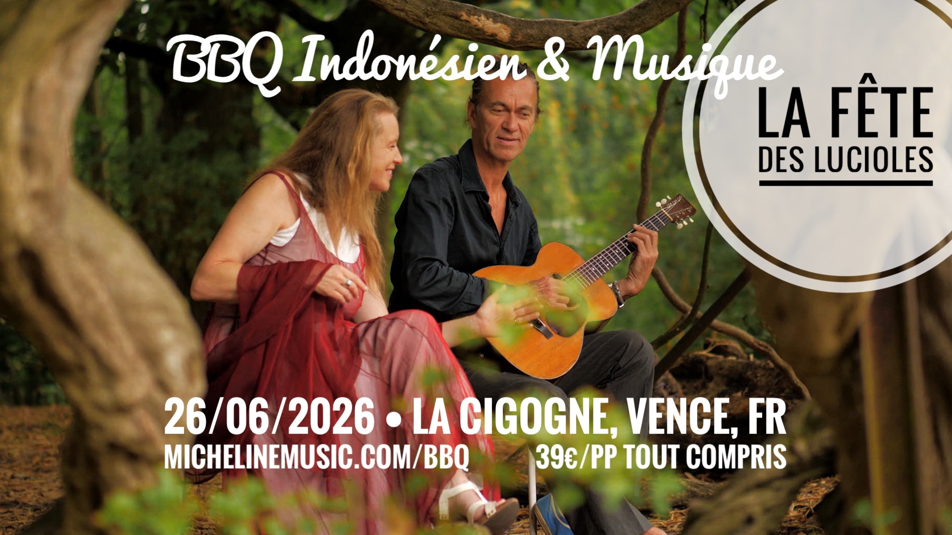 Join us at La Cigogne, Vence for an enchanting Indonesian evening under the stars & fire flies. ErWing — a master guitarist from Surabaya, Java — weaves spellbinding Krontjong melodies, joined by the captivating voice of chanteuse Micheline. Savour a festive BBQ, fine wines, and warm company at the Firefly Celebration.